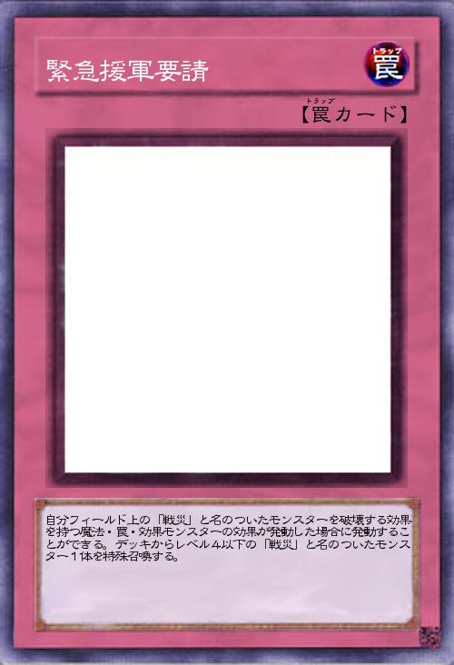 | 自分フィールド上の「戦災」と名のついたモンスターを破壊する効果を持つ魔法・罠・効果モンスターの効果が発動した場合に発動することができる。デッキからレベル4以下の「戦災」と名のついたモンスター1体を特殊召喚する。 | |||