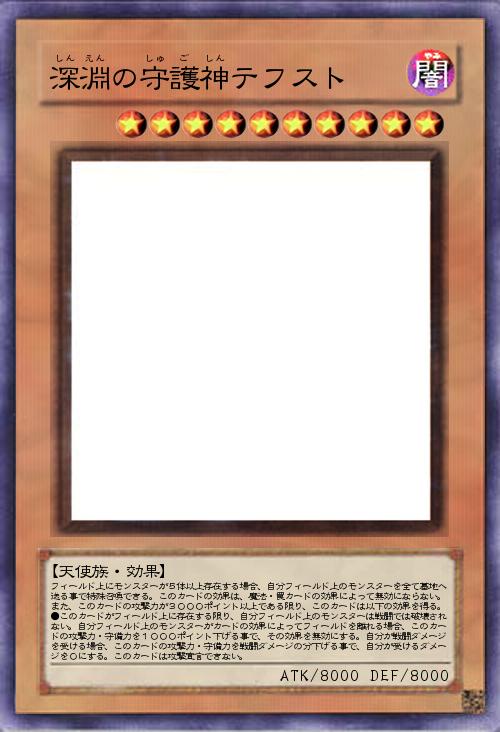 フィールド上にモンスターが5体以上存在する場合、自分フィールド上のモンスターを全て墓地へ送る事で特殊召喚できる。このカードの効果は、魔法・罠カードの効果によって無効にならない。また、このカードの攻撃力が3000ポイント以上である限り、このカードは以下の効果を得る。 ●このカードがフィールド上に存在する限り、自分フィールド上のモンスターは戦闘では破壊されない。自分フィールド上のモンスターがカードの効果によってフィールドを離れる場合、このカードの攻撃力・守備力を1000ポイント下げる事で、その効果を無効にする。自分が戦闘ダメージを受ける場合、このカードの攻撃力・守備力を戦闘ダメージの分下げる事で、自分が受けるダメージを0にする。このカードは攻撃宣言できない。 |