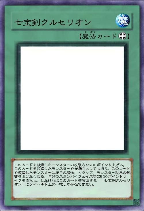 | このカードを装備したモンスターの攻撃力を500ポイント上げる。このカードを装備したモンスターを光属性としても扱う。このカードを装備したモンスターは相手の魔法、トラップ、モンスター効果の影響を受けなくなる。自分のスタンバイフェイズ時に500ポイントライフを支払う。しなければこのカードを破壊する。「七宝剣クルセリオン」はフィールド上に一枚しか存在できない。 | |||