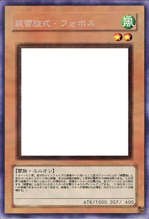 | 1ターンに1度、自分のメインフェイズに装備カード扱いとして自分フィールド上の「装雷旋」と名のついたモンスター1体に装備、または装備を解除して表側攻撃表示で特殊召喚できる。この効果で装備カード扱いとなっている場合のみ、装備モンスターの攻撃力は、自分フィールド上に存在する「装雷旋」と名のついたモンスターの攻撃力×400ポイントアップする。(1体のモンスターが装備できるユニオンは1体まで。装備モンスターが破壊される場合、代わりにこのカードを破壊する。) | |||
