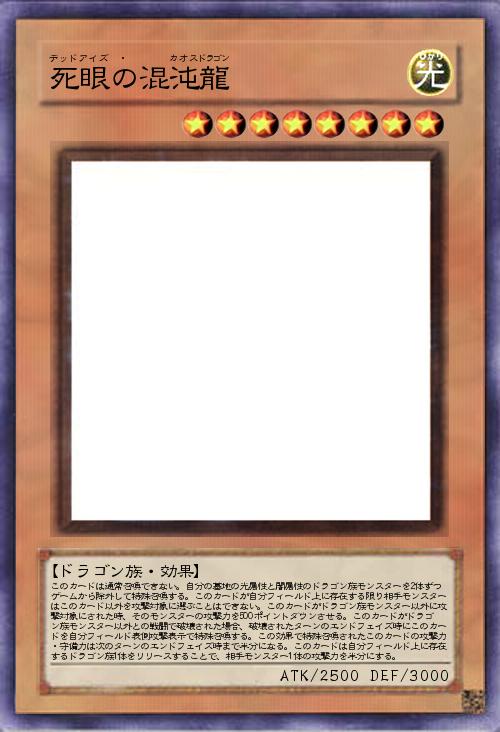 | このカードは通常召喚できない。自分の墓地の光属性と闇属性のドラゴン族モンスターを2体ずつゲームから除外して特殊召喚する。このカードが自分フィールド上に存在する限り相手モンスターはこのカード以外を攻撃対象に選ぶことはできない。このカードがドラゴン族モンスター以外に攻撃対象にされた時、そのモンスターの攻撃力を500ポイントダウンさせる。このカードがドラゴン族モンスター以外との戦闘で破壊された場合、破壊されたターンのエンドフェイズ時にこのカードを自分フィールド表側攻撃表示で特殊召喚する。この効果で特殊召喚されたこのカードの攻撃力・守備力は次のターンのエンドフェイズ時まで半分になる。このカードは自分フィールド上に存在するドラゴン族1体をリリースすることで、相手モンスター1体の攻撃力を半分にする。 | |||