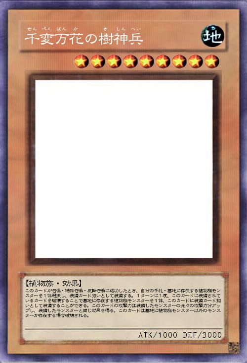 | このカードが召喚・特殊召喚・反転召喚に成功したとき、自分の手札・墓地に存在する植物族モンスターを1体選択し、装備カード扱いとして装備する。1ターンに1度、このカードに装備されているカードを破壊することで墓地に存在する植物族モンスターを1体、このカードに装備カード扱いとして装備することができる。このカードの攻撃力は装備したモンスターの元々の攻撃力分アップし、装備したモンスターと同じ効果を得る。このカードは墓地に植物族モンスター以外のモンスターが存在する場合破壊される。 | |||
