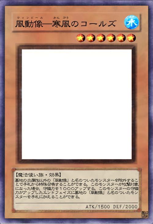 | 墓地の炎属性以外の「風動像」と名のついたモンスターを除外することで手札から特殊召喚することができる。このモンスターが攻撃対象になった場合、守備力を1000アップする。このモンスターの守備力がアップしたエンドフェイズに墓地の「風動像」と名のついたモンスターを手札に加えることができる。 | |||