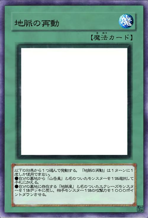 以下の効果から1つ選んで発動する。「地脈の再動」は1ターンに1度しか使用できない。 ●自分の墓地から「山岳皇」と名のついたモンスターを1体選択して手札に加える。 ●自分の墓地に存在する「地脈皇」と名のついたエクシーズモンスターを1体デッキに戻し、相手モンスター1体の攻撃力を1000ポイントダウンさせる。 |