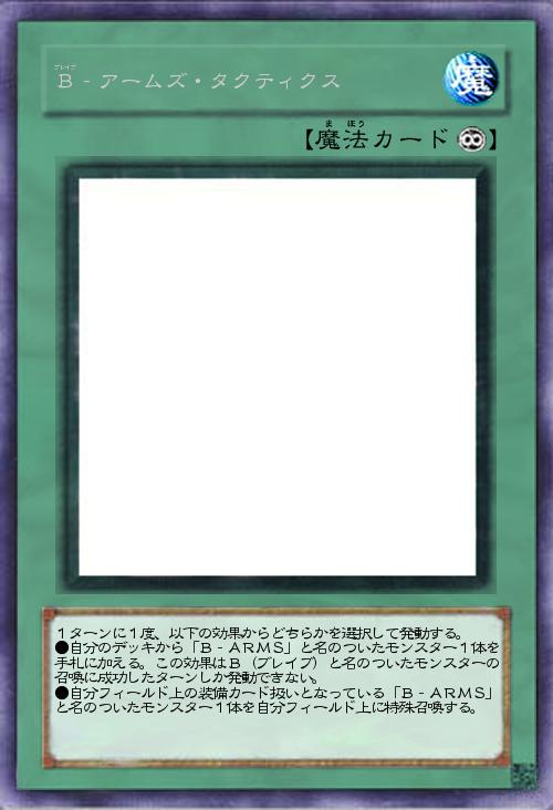 1ターンに1度、以下の効果からどちらかを選択して発動する。 ●自分のデッキから「B‐ARMS」と名のついたモンスター1体を手札に加える。この効果はB(ブレイブ)と名のついたモンスターの召喚に成功したターンしか発動できない。 ●自分フィールド上の装備カード扱いとなっている「B‐ARMS」と名のついたモンスター1体を自分フィールド上に特殊召喚する。 |