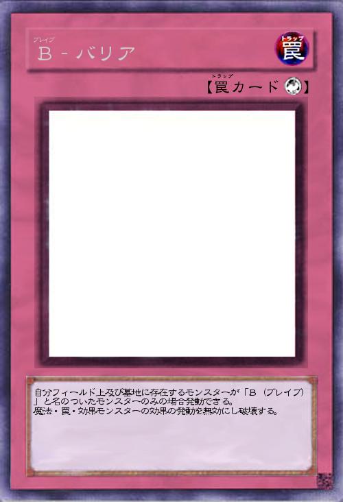 自分フィールド上及び墓地に存在するモンスターが「B(ブレイブ)」と名のついたモンスターのみの場合発動できる。 魔法・罠・効果モンスターの効果の発動を無効にし破壊する。 |