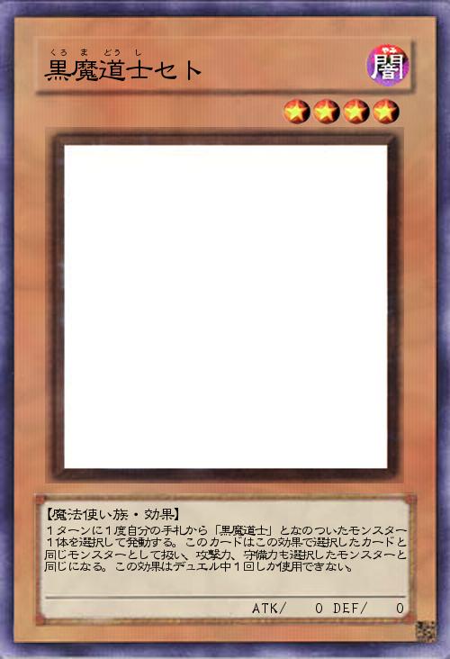| 1ターンに1度自分の手札から「黒魔道士」となのついたモンスター1体を選択して発動する。このカードはこの効果で選択したカードと同じモンスターとして扱い、攻撃力、守備力も選択したモンスターと同じになる。この効果はデュエル中1回しか使用できない。 | |||
