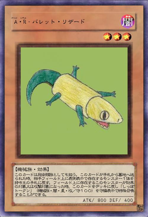 | このカードは爬虫類族としても扱う。このカードが手札から墓地へ送られた時、相手フィールド上に表側表示で存在するモンスター1体を持ち主の手札に戻す。フィールド上に存在するこのモンスターが効果の対象又は攻撃対象になった時、このカードをデッキに戻し「しっぽトークン」(機械族・闇・星・攻/守100)を守備表示で特殊召喚することができる。 | |||