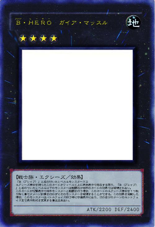 「B(ブレイブ)」と名の付いたレベル4モンスター×2 エクシーズ素材を持ったこのカードがフィールド上に表側表示で存在する限り、「B(ブレイブ)」と名のついたレベル4以下のモンスターは戦闘及び相手のカードの効果では破壊されない。 このカードが攻撃表示で相手モンスターと戦闘を行う場合、このカードのエクシーズ素材を1つ取り除く事でダメージ計算を行わずにそのモンスターを破壊することができる。この効果を発動した場合、このモンスターはバトルフェイズ終了時に守備表示になり、次の自分のターンのエンドフェイズまで表示形式を変更する事は出来ない。 |
