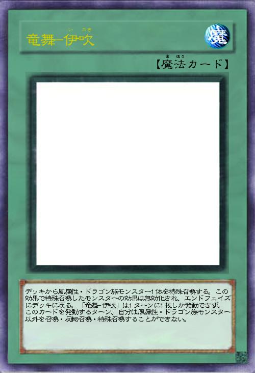 | デッキから風属性・ドラゴン族モンスター1体を特殊召喚する。この効果で特殊召喚したモンスターの効果は無効化され、エンドフェイズにデッキに戻る。「竜舞-伊吹」は1ターンに1枚しか発動できず、このカードを発動するターン、自分は風属性・ドラゴン族モンスター以外を召喚・反転召喚・特殊召喚することができない。 | |||