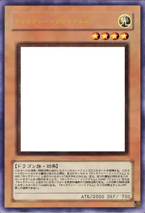| このカードの召喚・特殊召喚に成功したターンのエンドフェイズにこのカードを破壊する。このカードがフィールドから墓地に送られた場合、自分のデッキから「ギャラクシー・リンドブルム」以外の「ギャラクシー」と名のついたカード1枚を手札に加える。また、自分の墓地に存在するこのカードをゲームから除外することで、「ギャラクシー・リンドブルム」以外の「フォトン」または「ギャラクシー」と名のついたモンスターを表側守備表示で特殊召喚できる。この効果で特殊召喚したモンスターのレベルは8になる。「ギャラクシー・リンドブルム」のこの効果はデュエル中1度しか使用できない。 | |||