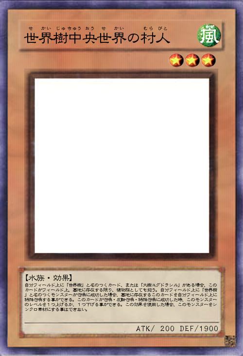 | 自分フィールド上に「世界樹」と名のつくカード、または「大樹ユグドラシル」がある場合、このカードがフィールド上、墓地に存在する限り、植物族としても扱う。自分フィールド上に「世界樹」と名のつくモンスターが召喚に成功した場合、墓地に存在するこのカードを自分フィールド上に特殊召喚する事ができる。このカードが召喚・反転召喚・特殊召喚に成功した時、このモンスターのレベルを1つ上げるか、1つ下げる事ができる。この効果を使用した場合、このモンスターをシンクロ素材にする事はできない。 | |||