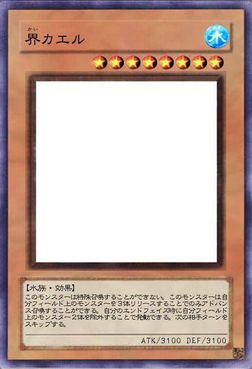 このモンスターは特殊召喚することができない。このモンスターは自分フィールド上のモンスターを3体リリースすることでのみアドバンス召喚することができる。自分のエンドフェイズ時に自分フィールド上のモンスター2体を除外することで発動できる。次の相手ターンをスキップする。 |