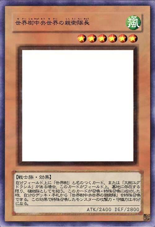 | 自分フィールド上に「世界樹」と名のつくカード、または「大樹ユグドラシル」がある場合、このカードがフィールド上、墓地に存在する限り、植物族としても扱う。このカードが召喚・特殊召喚に成功した時、自分のデッキ・手札から「世界樹中央世界の親衛隊」を特殊召喚できる。この効果で特殊召喚したモンスターの攻撃力・守備力は半分になる。 | |||