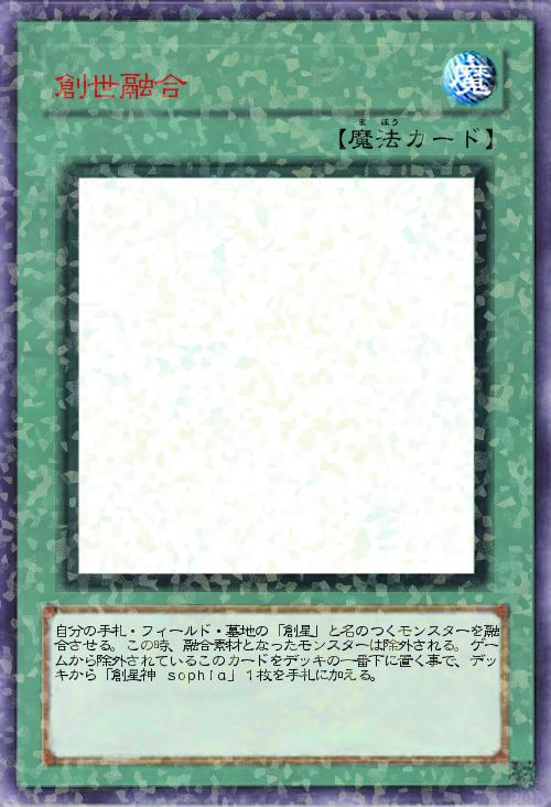 | 自分の手札・フィールド・墓地の「創星」と名のつくモンスターを融合させる。この時、融合素材となったモンスターは除外される。ゲームから除外されているこのカードをデッキの一番下に置く事で、デッキから「創星神 sophia」1枚を手札に加える。 | |||