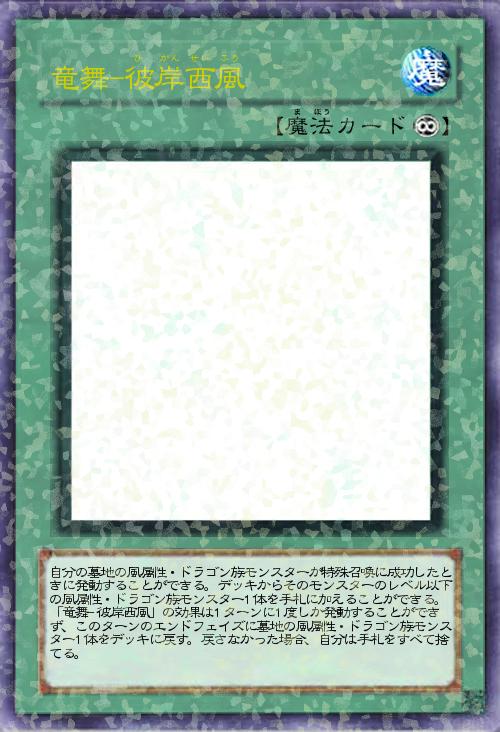 | 自分の墓地の風属性・ドラゴン族モンスターが特殊召喚に成功したときに発動することができる。デッキからそのモンスターのレベル以下の風属性・ドラゴン族モンスター1体を手札に加えることができる。「竜舞-彼岸西風」の効果は1ターンに1度しか発動することができず、このターンのエンドフェイズに墓地の風属性・ドラゴン族モンスター1体をデッキに戻す。戻さなかった場合、自分は手札をすべて捨てる。 | |||
