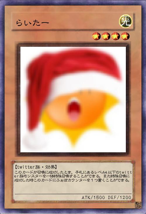| このカードが召喚に成功したとき、手札にあるレベル4以下のtwitter族モンスターを一体特殊召喚することができる。また特殊召喚に成功した時このカードにふぁぼカウンターを1つ置くことができる。 | |||