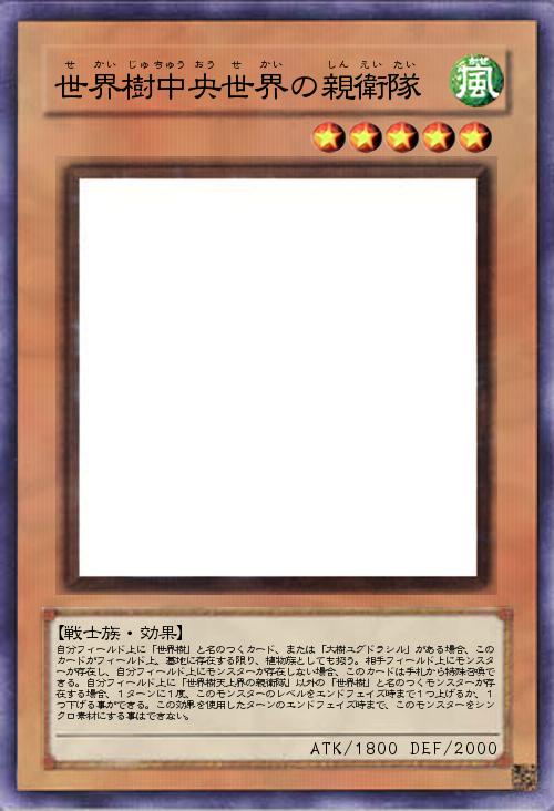自分フィールド上に「世界樹」と名のつくカード、または「大樹ユグドラシル」がある場合、このカードがフィールド上、墓地に存在する限り、植物族としても扱う。相手フィールド上にモンスターが存在し、自分フィールド上にモンスターが存在しない場合、このカードは手札から特殊召喚できる。自分フィールド上に「世界樹天上界の親衛隊」以外の「世界樹」と名のつくモンスターが存在する場合、1ターンに1度、このモンスターのレベルをエンドフェイズ時まで1つ上げるか、1つ下げる事ができる。この効果を使用したターンのエンドフェイズ時まで、このモンスターをシンクロ素材にする事はできない。 |