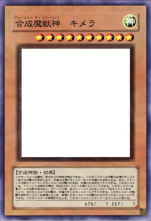 | このモンスターは墓地、除外からの特殊召喚はできない。このモンスターの攻撃力は場のモンスター全ての攻撃力の合計となり、守備力は場のモンスター全ての守備力の合計となる。また、アドバンス召喚でリリースしたモンスターの攻撃力の合計、守備力の合計をプラスできる。このモンスターは、アドバンス召喚する場合、5体までモンスターを選んでリリースできる。このモンスターは罠カードの効果を受けない。1ターンに1度、自分フィールド上のモンスター1体をリリースすることで、そのモンスターの攻撃力、守備力をこのモンスターにプラスできる。このモンスターが戦闘で相手モンスターを破壊したとき、破壊したモンスターの攻撃力の半分をこのモンスターにプラスする。このモンスターが破壊されたとき、このカードのコントローラーはデュエルに負ける。 | |||