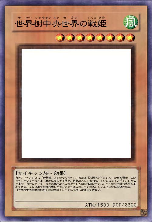 | 自分フィールド上に「世界樹」と名のつくカード、または「大樹ユグドラシル」がある場合、このカードがフィールド上、墓地に存在する限り、植物族としても扱う。1000ライフポイントを払う事で、自分のデッキ、または墓地からこのカードと同じ種族のモンスター1体を特殊召喚する事ができる。この効果で特殊召喚したモンスターはこのターンのエンドフェイズ時に破壊される。 「世界樹中央世界の戦姫」の効果は1ターンに1度しか使用できない。 | |||