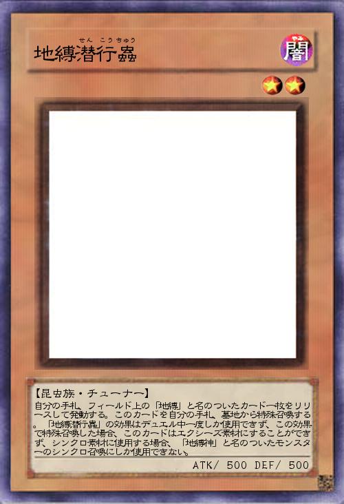 | 自分の手札、フィールド上の「地縛」と名のついたカード一枚をリリースして発動する。このカードを自分の手札、墓地から特殊召喚する。「地縛潜行蟲」の効果はデュエル中一度しか使用できず、この効果で特殊召喚した場合、このカードはエクシーズ素材にすることができず、シンクロ素材に使用する場合、「地縛神」と名のついたモンスターのシンクロ召喚にしか使用できない。 | |||