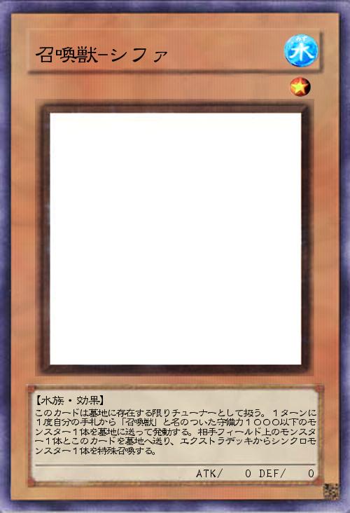 | このカードは墓地に存在する限りチューナーとして扱う。1ターンに1度自分の手札から「召喚獣」と名のついた守備力1000以下のモンスター1体を墓地に送って発動する。相手フィールド上のモンスター1体とこのカードを墓地へ送り、エクストラデッキからシンクロモンスター1体を特殊召喚する。 | |||