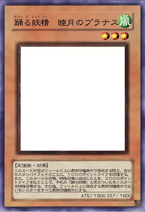 | このカードが自分フィールド上に表側守備表示で存在する限り、自分のスタンバイフェイズごとに、1000ポイントライフを回復する。また、このカードの召喚、特殊召喚に成功したとき、2000ポイントライフを払うことで、手札の「踊る妖精」と名のついたモンスターを特殊召喚する。その後、フィールド上に存在する表側守備表示でないモンスターをすべて表側守備表示にする。 | |||