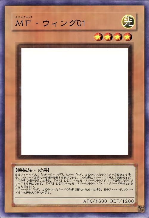 自分フィールド上に「MF-ウィング01」以外の「MF」と名のついたモンスターが存在する場合、このカードは手札から特殊召喚する事ができる。この効果は1ターンに1度しか発動できず、この効果で特殊召喚した場合、「MF」と名のついたモンスター以外のアドバンス召喚のためにリリースする事はできず、「MF」と名のついたモンスター以外のシンクロ・エクシーズ素材とすることもできない。 このカードが「MF」と名のついたカードの効果で墓地へ送られた場合、相手フィールド上のカードを1枚持ち主の手札へ戻す。 |