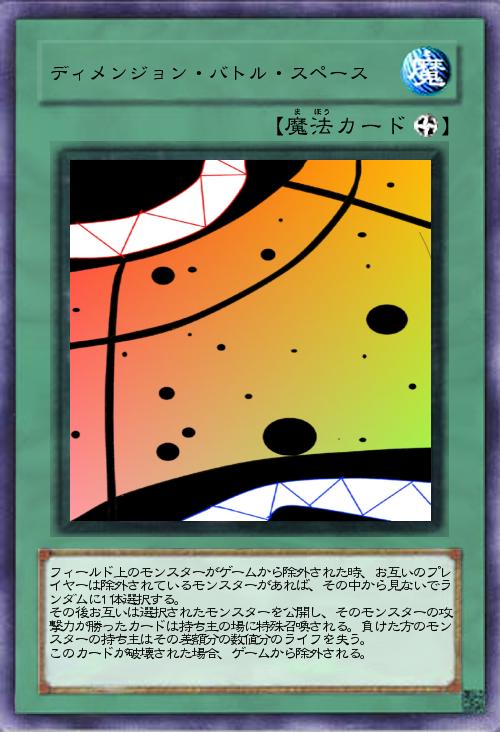 フィールド上のモンスターがゲームから除外された時、お互いのプレイヤーは除外されているモンスターがあれば、その中から見ないでランダムに1体選択する。 その後お互いは選択されたモンスターを公開し、そのモンスターの攻撃力が勝ったカードは持ち主の場に特殊召喚される。負けた方のモンスターの持ち主はその差額分の数値分のライフを失う。 このカードが破壊された場合、ゲームから除外される。 |