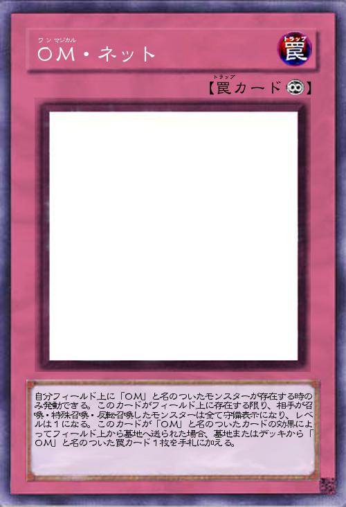 | 自分フィールド上に「OM」と名のついたモンスターが存在する時のみ発動できる。このカードがフィールド上に存在する限り、相手が召喚・特殊召喚・反転召喚したモンスターは全て守備表示になり、レベルは1になる。このカードが「OM」と名のついたカードの効果によってフィールド上から墓地へ送られた場合、墓地またはデッキから「OM」と名のついた罠カード1枚を手札に加える。 | |||