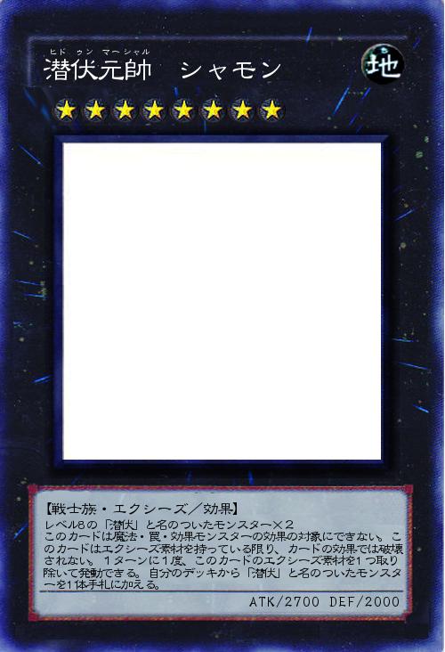レベル8の「潜伏」と名のついたモンスター×2 このカードは魔法・罠・効果モンスターの効果の対象にできない。このカードはエクシーズ素材を持っている限り、カードの効果では破壊されない。1ターンに1度、このカードのエクシーズ素材を1つ取り除いて発動できる。自分のデッキから「潜伏」と名のついたモンスターを1体手札に加える。 |