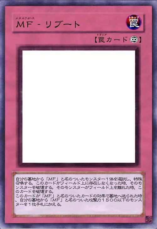 自分の墓地から「MF」と名のついたモンスター1体を選択し、特殊召喚する。このカードがフィールド上に存在しなくなった時、そのモンスターを破壊する。そのモンスターがフィールド上を離れた時、このカードを破壊する。 このカードが「MF」と名のついたカードの効果で墓地へ送られた時、自分の墓地から「MF」と名のついた攻撃力1500以下のモンスターを1枚手札に加える。 |