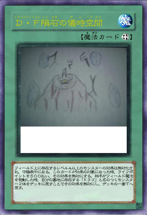 フィールド上に存在するレベル4以上のモンスターの効果は無効化され、守備表示になる。このカードが効果の対象になった時、ライフポイントを500払い、その効果を無効にする。相手がフィールド魔法を発動した時、自分の墓地に存在する「ドラゴ」と名のつくモンスター2体をデッキに戻すことでその効果を無効にし、デッキの一番下へ戻す。 |