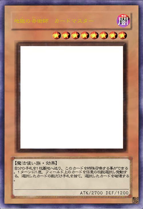 | 自分の手札を1枚墓地へ送り、このカードを特殊召喚する事ができる。1ターンに1度、フィールド上のカードを任意の枚数選択し発動する。選択したカードの数だけ手札を捨て、選択したカードを破壊する。 | |||