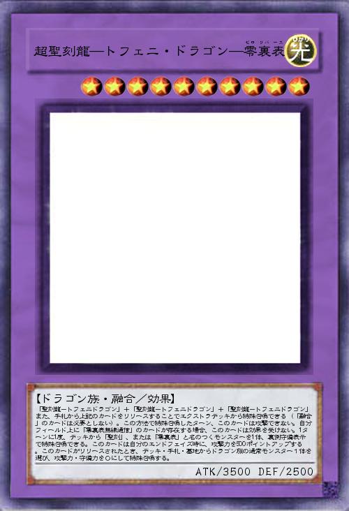 「聖刻龍-トフェニドラゴン」+「聖刻龍-トフェニドラゴン」+「聖刻龍-トフェニドラゴン」 また、手札から上記のカードをリリースすることでエクストラデッキから特殊召喚できる(「融合」のカードは必要としない)。この方法で特殊召喚したターン、このカードは攻撃できない。自分フィールド上に「零裏表無線通信」のカードが存在する場合、このカードは効果を受けない。1ターンに1度、デッキから「聖刻」、または「零裏表」と名のつくモンスターを1体、裏側守備表示で特殊召喚できる。このカードは自分のエンドフェイズ時に、攻撃力を500ポイントアップする。このカードがリリースされたとき、デッキ・手札・墓地からドラゴン族の通常モンスター1体を選び、攻撃力・守備力を0にして特殊召喚する。 |