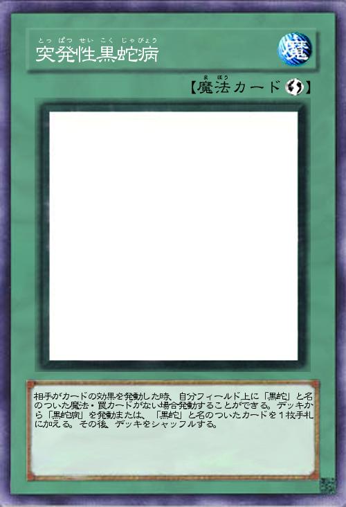 | 相手がカードの効果を発動した時、自分フィールド上に「黒蛇」と名のついた魔法・罠カードがない場合発動することができる。デッキから「黒蛇病」を発動または、「黒蛇」と名のついたカードを1枚手札に加える。その後、デッキをシャッフルする。 | |||