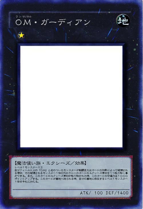 レベル1モンスター×2 自分フィールド上の「OM」と名のついたモンスターが戦闘またはカードの効果によって破壊される場合、その破壊されるモンスター1体の代わりにこのカードのエクシーズ素材を1つ取り除く事ができる。また、このカードのエクシーズ素材が取り除かれた時、このカードの守備力は1000ポイントアップする。このカードが墓地へ送られる時、自分の墓地に存在するレベル1モンスター1体を手札に加える。 |