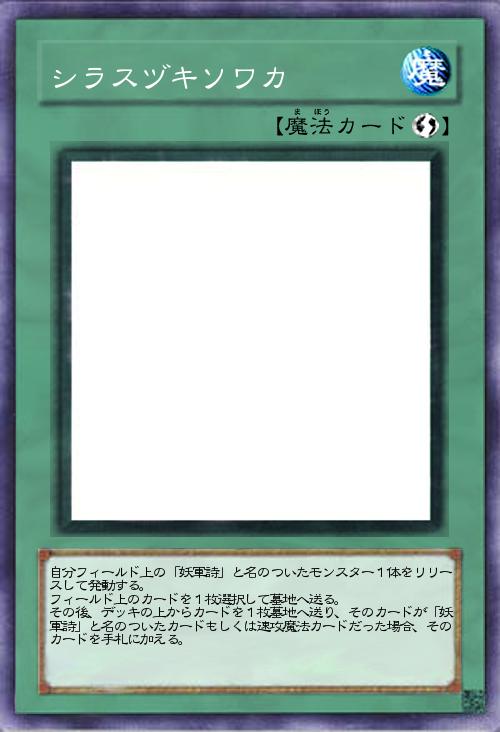 自分フィールド上の「妖軍詩」と名のついたモンスター1体をリリースして発動する。 フィールド上のカードを1枚選択して墓地へ送る。 その後、デッキの上からカードを1枚墓地へ送り、そのカードが「妖軍詩」と名のついたカードもしくは速攻魔法カードだった場合、そのカードを手札に加える。 |