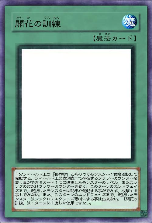 | 自分フィールド上の「世界樹」と名のつくモンスター1体を選択して発動する。フィールド上に表側表示で存在するフラワーカウンターを置く事ができるカード1つに選択したモンスターのレベル、またはランクの数だけフラワーカウンターを置く。このターンのエンドフェイズまで、選択したモンスターは効果を発動する事ができず、攻撃する事もできない。また、このターンのエンドフェイズまで、選択したモンスターはシンクロ・エクシーズ素材にする事は出来ない。「開花の訓練」は1ターンに1度しか使用できない。 | |||