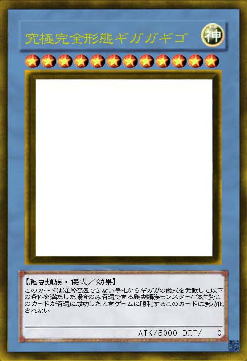 | このカードは通常召還できない手札からギガガの儀式を発動して以下の条件を満たした場合のみ召還できる爬虫類族モンスター4体生贄このカードが召還に成功したときゲームに勝利するこのカードは無効化されない | |||