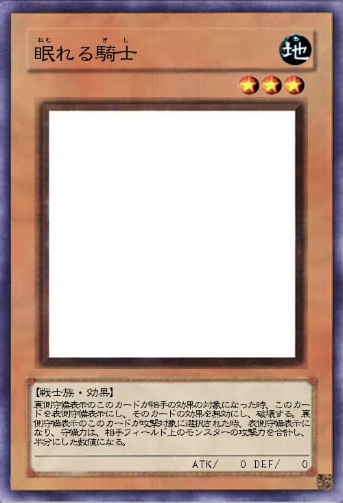 | 裏側守備表示のこのカードが相手の効果の対象になった時、このカードを表側守備表示にし、そのカードの効果を無効にし、破壊する。裏側守備表示のこのカードが攻撃対象に選択された時、表側守備表示になり、守備力は、相手フィールド上のモンスターの攻撃力を合計し、半分にした数値になる。 | |||