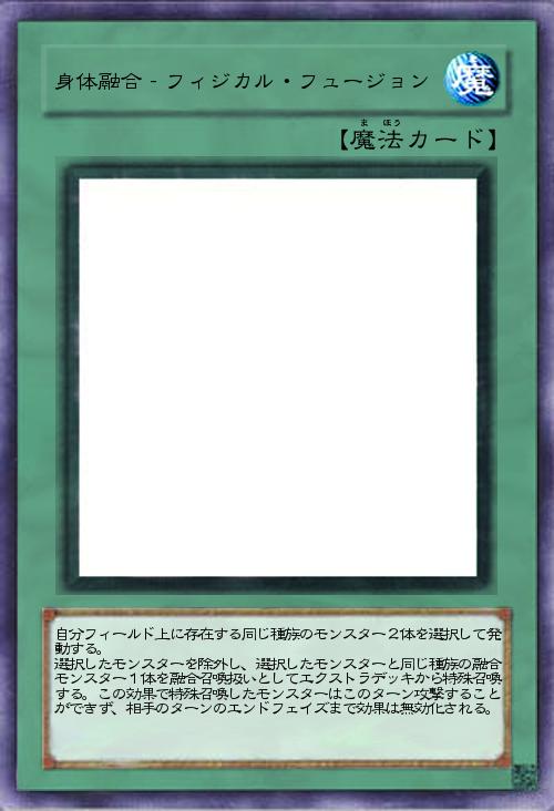 自分フィールド上に存在する同じ種族のモンスター2体を選択して発動する。 選択したモンスターを除外し、選択したモンスターと同じ種族の融合モンスター1体を融合召喚扱いとしてエクストラデッキから特殊召喚する。この効果で特殊召喚したモンスターはこのターン攻撃することができず、相手のターンのエンドフェイズまで効果は無効化される。 |