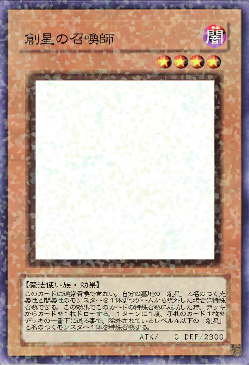 | このカードは通常召喚できない。自分の墓地の「創星」と名のつく光属性と闇属性のモンスターを1体ずつゲームから除外した場合に特殊召喚できる。この効果でこのカードの特殊召喚に成功した時、デッキからカードを1枚ドローする。1ターンに1度、手札のカード1枚をデッキの一番下に送る事で、除外されているレベル4以下の「創星」と名のつくモンスター1体を特殊召喚する。 | |||