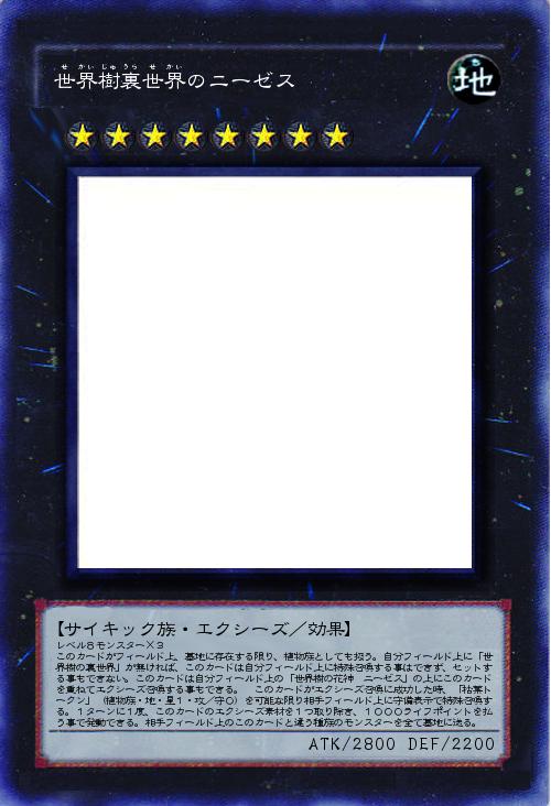 レベル8モンスター×3 このカードがフィールド上、墓地に存在する限り、植物族としても扱う。自分フィールド上に「世界樹の裏世界」が無ければ、このカードは自分フィールド上に特殊召喚する事はできず、セットする事もできない。このカードは自分フィールド上の「世界樹の花神 ニーゼス」の上にこのカードを重ねてエクシーズ召喚する事もできる。 このカードがエクシーズ召喚に成功した時、「枯葉トークン」(植物族・地・星1・攻/守0)を可能な限り相手フィールド上に守備表示で特殊召喚する。1ターンに1度、このカードのエクシーズ素材を1つ取り除き、1000ライフポイントを払う事で発動できる。相手フィールド上のこのカードと違う種族のモンスターを全て墓地に送る。 |