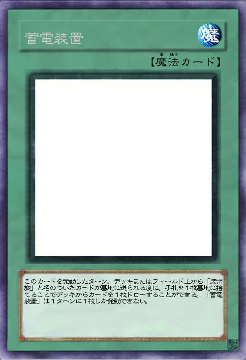 | このカードを発動したターン、デッキまたはフィールド上から「装雷旋」と名のついたカードが墓地に送られる度に、手札を1枚墓地に捨てることでデッキからカードを1枚ドローすることができる。「蓄電装置」は1ターンに1枚しか発動できない。 | |||