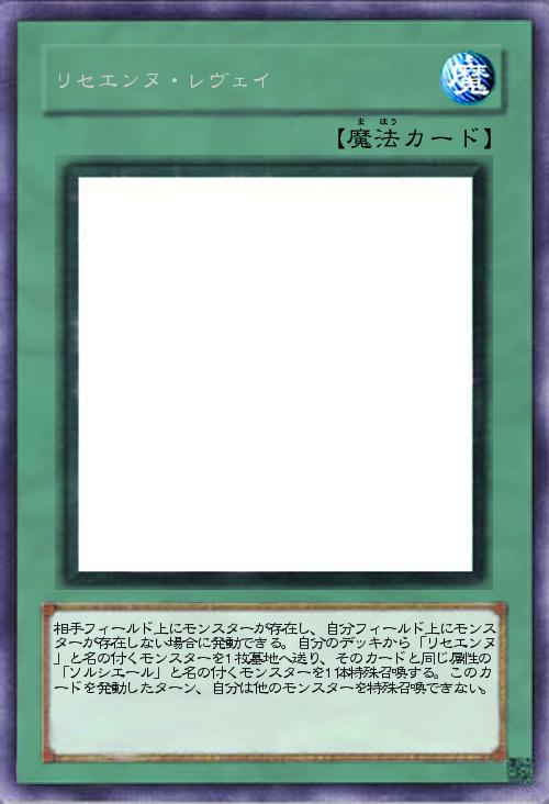 | 相手フィールド上にモンスターが存在し、自分フィールド上にモンスターが存在しない場合に発動できる。自分のデッキから「リセエンヌ」と名の付くモンスターを1枚墓地へ送り、そのカードと同じ属性の「ソルシエール」と名の付くモンスターを1体特殊召喚する。このカードを発動したターン、自分は他のモンスターを特殊召喚できない。 | |||