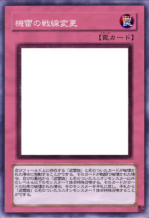 | 自分フィールド上に存在する「装雷旋」と名のついたカードが破壊された場合に発動することができる。そのカードが戦闘で破壊された場合、自分の墓地から「装雷旋」と名のついたユニオンモンスター以外のレベル4以下のモンスター1体を特殊召喚する。そのカードがカードの効果で破壊された場合、そのモンスターを手札に戻し、手札から「装雷旋」と名のついたユニオンモンスター1体を特殊召喚することができる。 | |||