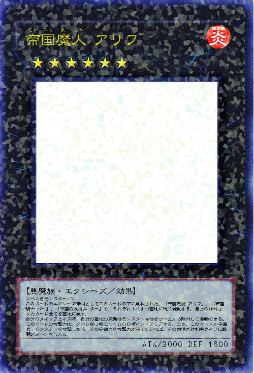 レベル6モンスターx3 このカードのエクシーズ素材としてこのカードの下に重ねられた、「帝国竜騎 アリフ」、「帝国騎士 バー」、「帝国の長槍兵 ター」を、それぞれ1枚ずつ墓地に送り発動する。自分の除外されたカード全てを墓地に戻す。 自分のメインフェイズ時、自分の墓地の炎属性モンスター4体をゲームから除外して発動できる。このカードの攻撃力は、ターン終了時まで1000ポイントアップする。また、このカードが守備表示モンスターを攻撃した時、その守備力を攻撃力が超えていれば、その数値だけ相手ライフに戦闘ダメージを与える。 |