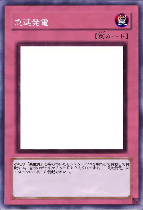 | 手札の「装雷旋」と名のついたモンスター1体を除外して発動して発動する。自分のデッキからカードを2枚ドローする。「急速発電」は1ターンに1枚しか発動できない。 | |||