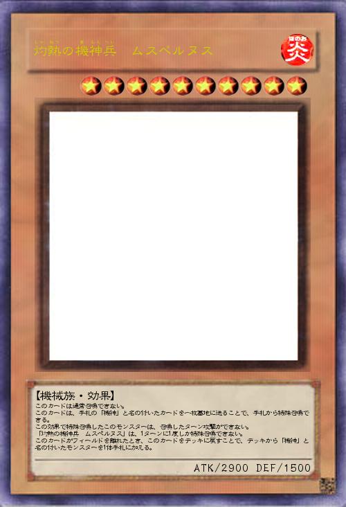 このカードは通常召喚できない。 このカードは、手札の「機神」と名の付いたカードを一枚墓地に送ることで、手札から特殊召喚できる。 この効果で特殊召喚したこのモンスターは、召喚したターン攻撃ができない。 「灼熱の機神兵 ムスペルヌス」は、1ターンに1度しか特殊召喚できない。 このカードがフィールドを離れたとき、このカードをデッキに戻すことで、デッキから「機神」と名の付いたモンスターを1体手札に加える。 |
